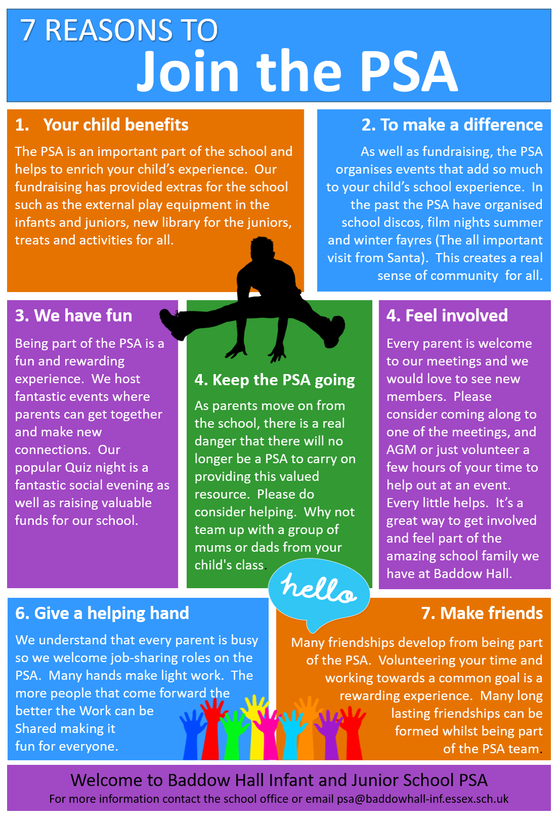 Our Baddow Hall PSA Facebook page is regularly updated so please find and like us on Facebook, we can also be contacted via our email address psa@baddowhall-inf.essex.sch.uk. Regular PSA Newsletters with information regarding forthcoming events, diary dates and requests for assistance with our larger events will be emailed to parents via the schools’ offices.